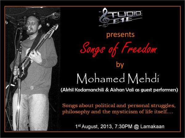 Mohamed Mehdi is a musician, composer, and professor of philosophy (Chicago).His songs are influenced by reggae, folk-rock and Indian styles of music combining themes of political and personal struggle, philosophical questioning and mysticism. The thread that links these songs is the fight for freedom at every level. At Lamakaan, He will be performing original compositions with the support of talented guest artistes from Hyderabad. This interactive performance will make you sing, think and participate.